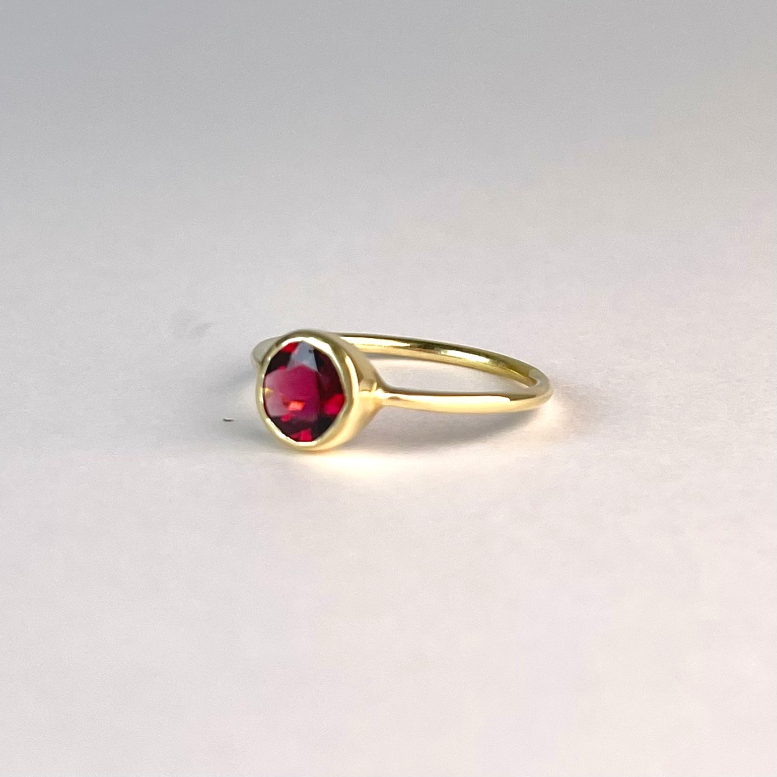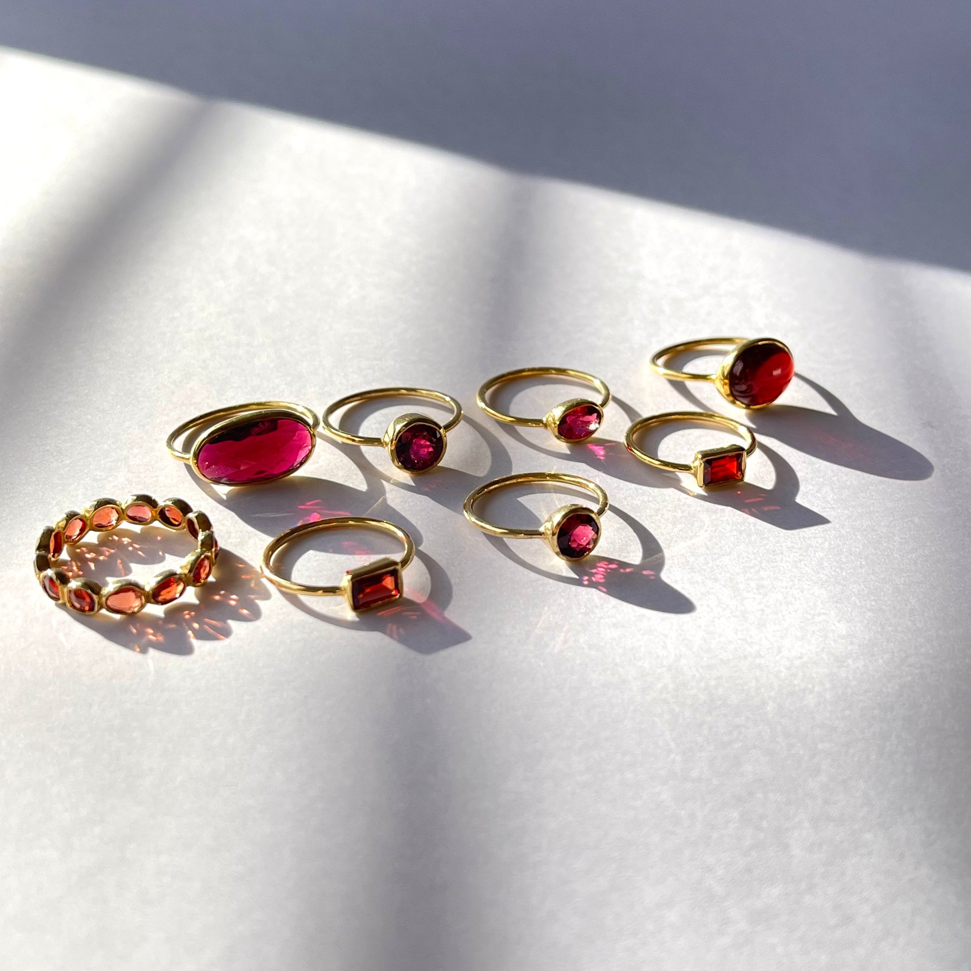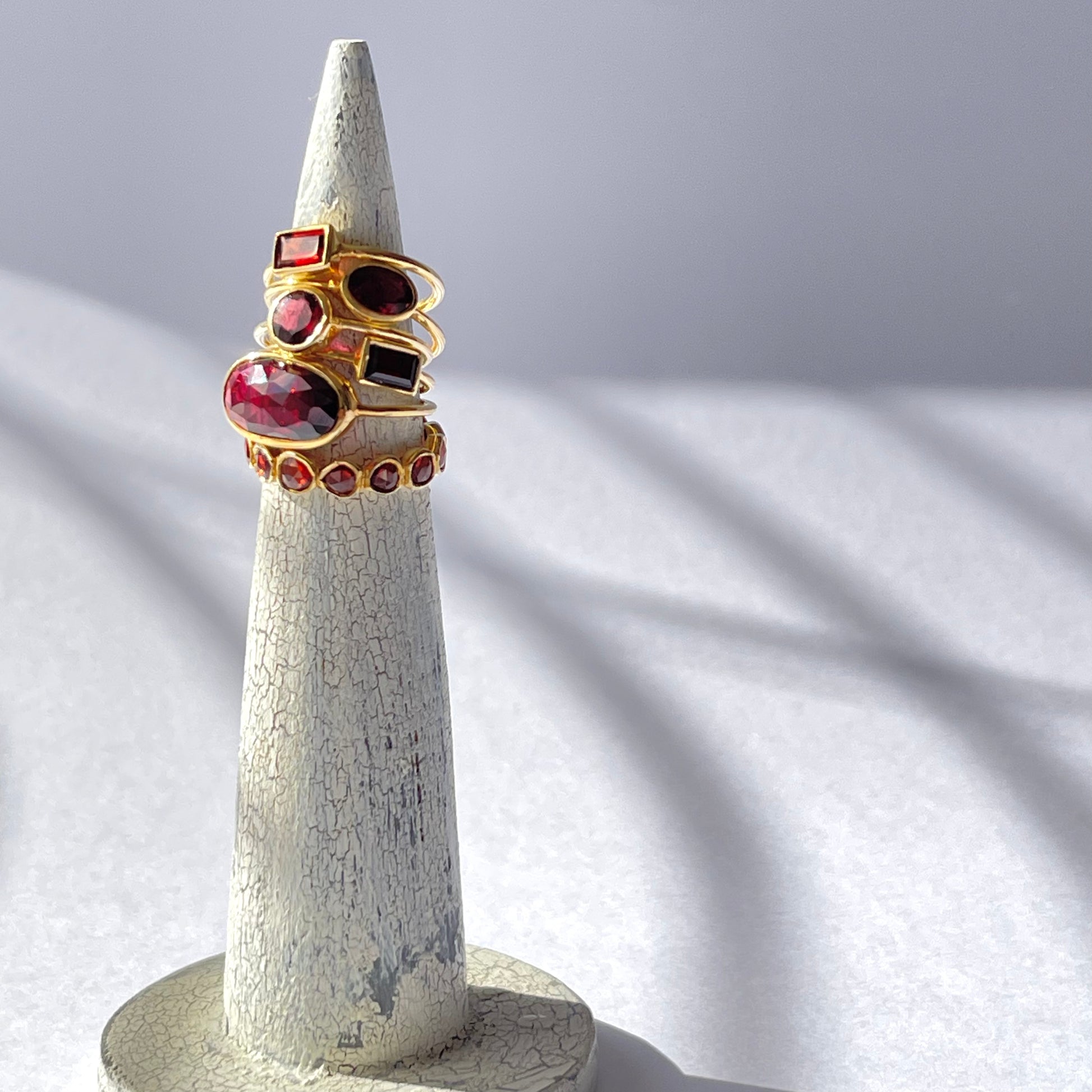 華やかなワインレッドのガーネットに丁寧なカットを施し、光のあたり方によってさまざまな表情を見せてくれます。